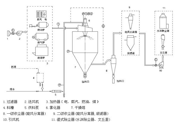 空氣通過過濾器和加熱器,進入干燥器頂部的空氣分配器,熱空氣呈螺旋狀均勻進入干燥器。料液由料液槽經(jīng)過濾器由泵送至干燥器的離心霧化器,使料液噴成績效的霧狀液滴,料液和熱空氣并流接觸水分迅速蒸發(fā),在短時間內(nèi)干燥為粉末狀成品。成品由于干燥塔地步和旋風分離器排除,廢棄由風機排出。