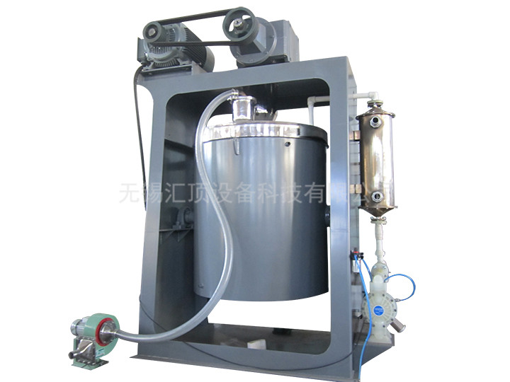 一種制造微粉的立式球磨機,它是通過電機驅(qū)動立式減速機,通過聯(lián)軸節(jié),帶動內(nèi)轉(zhuǎn)子研磨裝置旋轉(zhuǎn),使磨球、磨料、水混合液懸浮研磨。研磨過程中,水、磨料混合液通過循環(huán)系統(tǒng)連續(xù)循環(huán),直到達到標(biāo)準(zhǔn)。本裝置的特征在于:該內(nèi)轉(zhuǎn)子研磨裝置是由若干個沿攪拌軸螺旋上升的金屬攪棒垂直安裝的。